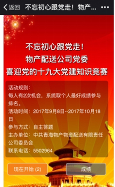 (物產配送公司 訊 龐玲/文)為了迎接黨的十九大勝利召開,物產配送公司黨委在9月8日-10月18日期間開展"喜迎黨的十九大"微信公眾平臺黨建知識答題活動。
