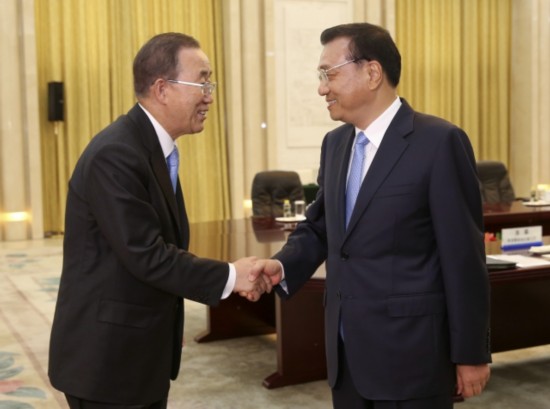 李克強總理會見聯合國秘書長潘基文時說:"人類面臨的最大挑戰,是在處理'減貧'和'應對氣候變化'兩個問題的過程中,取得一個平衡點。"