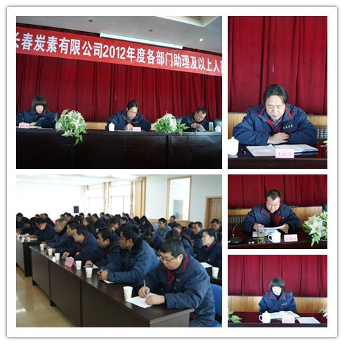 2013年1月10日,青海長春炭素有限公司在五樓會議室召開了2012年度各部門助理以上人員考評會議,黨總支書記、公司總經理王松華、副總經理姜紅萍、張秉瑜和各部門助理以上人員、職工代表共77人參加了會議。會議由副總經理張秉瑜主持。